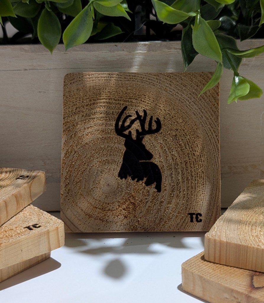 A beautiful set of 4 handmade wooden coasters with a stunning deer foot print and body. Bring a little wild life to your table. Each coaster is hand cut, hand designed, burned and coated for the ultimate hand made wooden coaster.